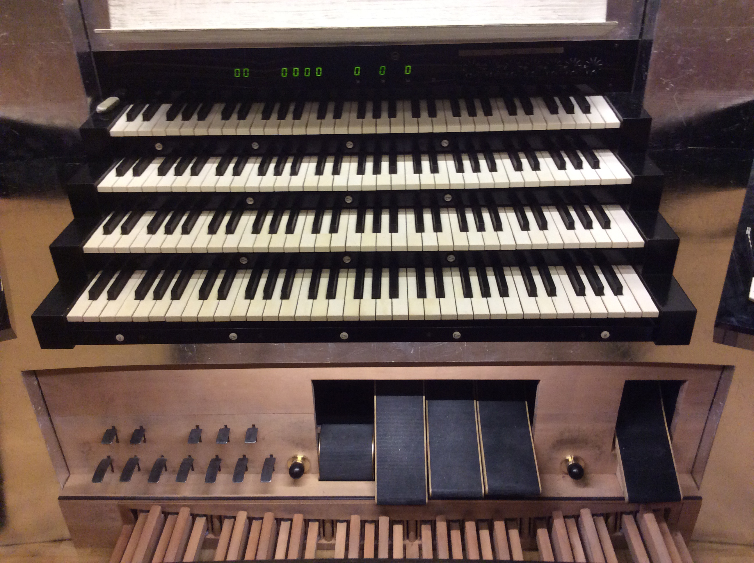 If you look closely at the photo above, you'll see that several other numbers are also displayed in green lights. (You probably won't make any use of them; but I may as well explain what they are, in case you're curious.) At the left of ‘0000’ in the illustration, which is the all-important current sequence number, there's a two-digit number ‘00’. That's the current position of the Rollschweller, and it ranges from ‘00’ (no stops) to ‘61’ (all stops), as explained below. At the right of ‘0000’ there are three one-digit numbers ‘0’, ‘0’, ‘0’; ignore them! They were once intended to indicate the current settings of the three swell shades, and there had been some thought of allowing those shades to be controlled electronically. But at the present time they are always ‘0’, and the shades are 100% controlled by your feet alone. The only way to tell the amounts by which the shades are currently open or shut is to look at (or feel) those foot controllers.Notice also the little white buttons that appear below each of the four manuals in the photo. Almost all of those buttons are labeled ‘▷’. Whenever you press ‘▷’, the current combination number advances by 1. (Also 9999 advances to 0000.) Those handy buttons are your friends, because one of your thumbs will almost always be near one of them. The photo also shows two dark brown, spherical toe studs above the pedalboard; those toe studs give you another way to advance by 1, when your hands are busy.