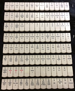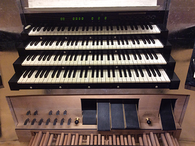As you sit in front of the keyboards, you have easy access to two banks of stop-tablets, one on each side. At the left are the stops for the Hauptwerk and Pedal, numbered 1–104; at the right are those for the Solo, Récit, and Positiv, numbered 105–208: