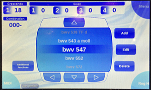 At this point you have the desired combination 0001 all set up, according to the console lights. And you can play the organ using those stops, if you want to remind yourself how those stops sound. But combination number 0000 (or ‘000-’) still appears on the organ, and on the touchscreen; and the new combination has not yet been entered into the system, even though you've said SET! Beware: If you now try to advance by pushing one of the little white ‘▷’ buttons, you'll find to your dismay that the new combination has been lost! What is going on?