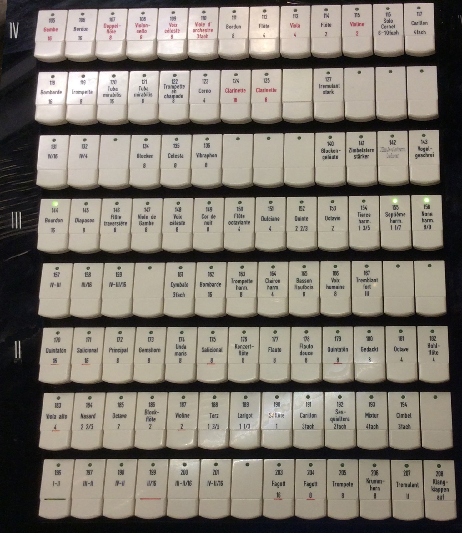 A stop is activated by pushing on the corresponding stop-tablet. A green light then goes on. For example, in the picture above, only three stops are active, namely numbers 144, 155, 156. (These are the Bourdon 16, Septième harmonique 1 1/3, and None harmonique 7/8, in the top row of the stops for the Récit manual III. It's a strange combination, but actually worth a try!) To deactive a stop, just push its tablet again. Several stops can be changed at once, by doing an appropriate “tablet glissando.”