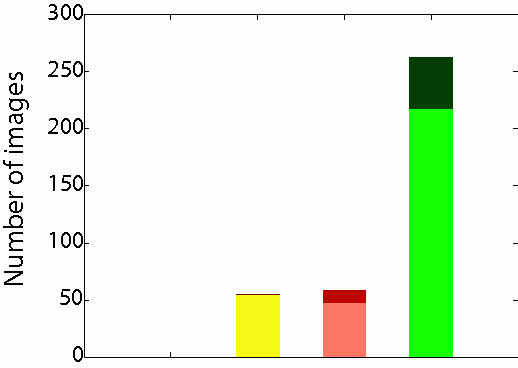 The blue bar is the number of images in the LabelMe dataset, the yellow bar is the number of images in Caltech 101 clean dataset collected manually from the Caltech101 raw dataset. Red bar represents the number of collected clean images (P) by OPTIMOL from Caltech101 raw dataset with the dark red part at the top of the red bar representing the number of False Positives (F). Green bar shows the number of clean images collected by OPTIMOL from our own downloaded images using the category name as the query word plus the Caltech101 raw dataset. The dark green part at the top is the number of False Positives. |