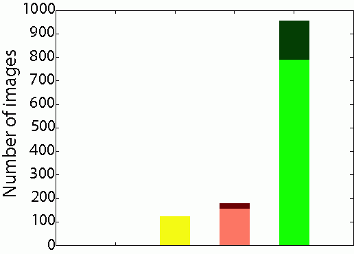 The blue bar is the number of images in the LabelMe dataset, the yellow bar is the number of images in Caltech 101 clean dataset collected manually from the Caltech101 raw dataset. Red bar represents the number of collected clean images (P) by OPTIMOL from Caltech101 raw dataset with the dark red part at the top of the red bar representing the number of False Positives (F). Green bar shows the number of clean images collected by OPTIMOL from our own downloaded images using the category name as the query word plus the Caltech101 raw dataset. The dark green part at the top is the number of False Positives. |