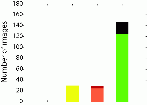 The blue bar is the number of images in the LabelMe dataset, the yellow bar is the number of images in Caltech 101 clean dataset collected manually from the Caltech101 raw dataset. Red bar represents the number of collected clean images (P) by OPTIMOL from Caltech101 raw dataset with the dark red part at the top of the red bar representing the number of False Positives (F). Green bar shows the number of clean images collected by OPTIMOL from our own downloaded images using the category name as the query word plus the Caltech101 raw dataset. The dark green part at the top is the number of False Positives. |