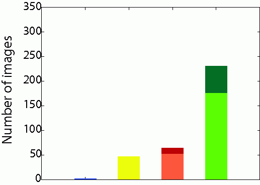 The blue bar is the number of images in the LabelMe dataset, the yellow bar is the number of images in Caltech 101 clean dataset collected manually from the Caltech101 raw dataset. Red bar represents the number of collected clean images (P) by OPTIMOL from Caltech101 raw dataset with the dark red part at the top of the red bar representing the number of False Positives (F). Green bar shows the number of clean images collected by OPTIMOL from our own downloaded images using the category name as the query word plus the Caltech101 raw dataset. The dark green part at the top is the number of False Positives. |
