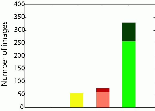 The blue bar is the number of images in the LabelMe dataset, the yellow bar is the number of images in Caltech 101 clean dataset collected manually from the Caltech101 raw dataset. Red bar represents the number of collected clean images (P) by OPTIMOL from Caltech101 raw dataset with the dark red part at the top of the red bar representing the number of False Positives (F). Green bar shows the number of clean images collected by OPTIMOL from our own downloaded images using the category name as the query word plus the Caltech101 raw dataset. The dark green part at the top is the number of False Positives. |