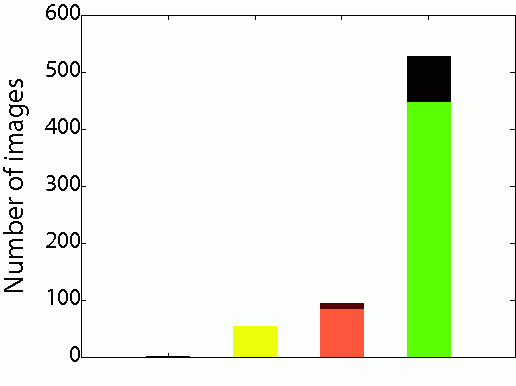 The blue bar is the number of images in the LabelMe dataset, the yellow bar is the number of images in Caltech 101 clean dataset collected manually from the Caltech101 raw dataset. Red bar represents the number of collected clean images (P) by OPTIMOL from Caltech101 raw dataset with the dark red part at the top of the red bar representing the number of False Positives (F). Green bar shows the number of clean images collected by OPTIMOL from our own downloaded images using the category name as the query word plus the Caltech101 raw dataset. The dark green part at the top is the number of False Positives. |