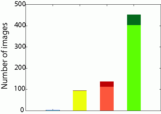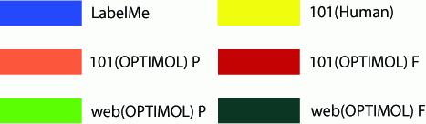 The blue bar is the number of images in the LabelMe dataset, the yellow bar is the number of images in Caltech 101 clean dataset collected manually from the Caltech101 raw dataset. Red bar represents the number of collected clean images (P) by OPTIMOL from Caltech101 raw dataset with the dark red part at the top of the red bar representing the number of False Positives (F). Green bar shows the number of clean images collected by OPTIMOL from our own downloaded images using the category name as the query word plus the Caltech101 raw dataset. The dark green part at the top is the number of False Positives. |