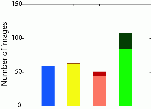The blue bar is the number of images in the LabelMe dataset, the yellow bar is the number of images in Caltech 101 clean dataset collected manually from the Caltech101 raw dataset. Red bar represents the number of collected clean images (P) by OPTIMOL from Caltech101 raw dataset with the dark red part at the top of the red bar representing the number of False Positives (F). Green bar shows the number of clean images collected by OPTIMOL from our own downloaded images using the category name as the query word plus the Caltech101 raw dataset. The dark green part at the top is the number of False Positives. |