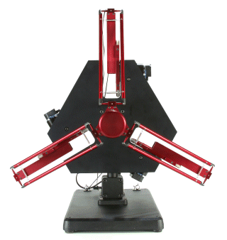Based on the design of the Delta robot which was developed at EPFL by Professor Raymond Clavel, the DELTA haptic device was designed at the VRAI Group and later commercialized by Force Dimension. Based on a parallel structure, the system is composed of three main arms which join together at the end-effector. The articulated arms are actuated by three motors which are all mounted onto the base of the device making it a highly robust system. The main distinctions of the DELTA haptic device mechanism are its low inertia, high stiffness and large range of forces. An interesting property of its kinematics model is the fact that the end-effector plate always remains parallel to the base of the device independently of its position, consequently allowing rotation motions of the user handle to be decoupled from any translations.