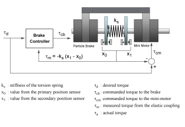 To address these problems we developed a new actuation approach composed of brakes, springs and micro motors. In this new actuation scheme, mini-motors are directly coupled to the links of the device to produce low forces at high frequencies (i.e. surface textures, small impacts). The higher forces are generated by connecting in parallel to the mini-motors a set of particle brakes coupled with torsion springs. When the brakes are engaged and the user moves the end-effector, energy is stored into the torsion spring and a force is perceived at the user handle. On a multi degree-of-freedom haptic device, the force is a result of the contribution of each torsion spring. The direction and magnitude of the force can be reoriented or reduced by release the brakes in a controlled manner. By efficiently controlling both the brakes and the mini motors it is possible to render virtual shapes and textures in a very realistic manner and with much less electrical power compared to a classic motor-only actuation approach. The overall safety is also highly improved because mini motors cannot strike the operators with high active forces.