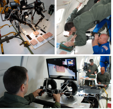 During four days (September 25-28, 2007), in collaboration with a team of researchers and surgeons, we evaluated the benefits of robotic surgery on air and space flights by performing incision and suturing tasks aboard a NASA C-9 aircraft. Through parabolic flights, the aircraft simulated the microgravity of space and variable gravity of military critical care air transport. An experimental setup composed of a surgical robot manipulator M7 (SRI) and two omega.7 force feedback interfaces (Force Dimension) were programmed to compensate for errors in movement which occurred in moments of turbulence and transition in gravity. The experiments were directed by surgeons from the University of Cincinnati.
