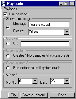 Whatever they're called, one thing is common among all script kiddies: "true" hackers hate them.[9] The "real" hackers despise the lazy maliciousness employed by such script kiddies and time and again try to separate themselves from being placed into the same category.[10] Script kiddies are important to mention because most of the major computer attacks over the past two years have been caused by these new members of the hacking community. The recent Anna Kournikova virus is a good example. The virus was released into the wild on February 11th, and by February 14th, hundreds of thousands of copies were circulating the Internet, jumping from computer to computer as curious users clicked on an attachment purporting to be a photograph of the famous Russian tennis star. So who was the skilled programmer who crafted such an effective virus? Surely it was the work of a veteran hacker, perhaps a disgruntled tennis player with a PhD in Computer Science? In reality, the author of the virus was a twenty-year-old Dutch man who goes by the alias "OnTheFly." After posting an anonymous letter on a Dutch Web Site and turning himself in to his local police, authorities began questioning the man to his motives. Fitting perfectly to the script kiddie stereotype, his own letter claimed that he did not actually know how to program a computer.[11] Instead, the man used a popular "virus toolkit" called the VBS Worm Generator to make his mass-mailer in a simple point and click fashion. Such toolkits have been around since 1990[12] , but in recent years their power and ease of use has risen dramatically. This particular toolkit requires almost no technical know-how beyond the ability to use a mouse and allows the user to customize the type and severity of attack associated with his virus. Here is a screenshot from the toolkit, courtesy of ZDNet: [13]