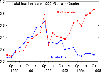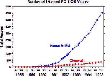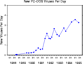 Biological Disease Spread [Top] The problem with a strict biological comparison is that, in some ways, the computer world is more variable than the human body. For example, the various ways in which people thwart computer virus epidemics raises some interesting issues. As Kephardt and White note, "After discovering a viral infection, users may initially become much more conscientious about using anti-virus software, but if a long time passes without incident they may relax their vigilance to some degree. Models analogous to this scenario have been studied within a biological context, for there are some cases in which the body gradually loses its immunity to a particular disease [2]. Another interesting notion is the ``kill signal'', a message sent by a node upon discovering that it is infected, warning all nodes to which it is connected that they may also be infected. Our preliminary investigations suggest that this may be one of the most powerful means for thwarting epidemics."[3] The idea of the kill signal is not new, for cell signaling in the human immune system is one of the most effective methods for halting the further infection of a pathogen. Kephardt and White hope that we will be able to adapt other biological protection mechanisms to the computer world, but for now, virus detection and cleaning remains a rather discrete process. See How Anti-Virus Software Works See also: Since the Internet has grown exponentially over the past decade, it is reasonable to assume that viruses have followed a similar pattern. However, prior to 1995, the actual statistics on virus prevalence did not agree entirely with this pattern. A study from 1995[4] demonstrated the growth curve of viruses since 1988. Not only had the overall number of viruses increased (Fig 1), but the rate of infections had increased as well (Fig 2). According to the study, this rate of increase followed a linear pattern, quadratic at worst, but was nowhere near exponential. Another interesting statistic is that, in 1995, two-thirds of all virus incidents were caused by the top ten viruses (Fig 3). ![]() Figure 1: Cumulative number of viruses for which signatures have been obtained by IBM's High Integrity Computing Laboratory vs. time. There are thousands of viruses, but only a few have been seen in real incidents.[5] ![]() Figure 2:The number of new viruses appearing worldwide per day has been increasing steadily.[6] ![]() Figure 3: The top ten viruses account for two thirds of all incidents. All of them are boot-sector infectors.[7] In 1996, ICSA Labs, a division of TruSecure Corporation, began publishing an annual report called "The ICSA Computer Virus Prevalence Survey." The most recent survey contains data for the past five years and shows that viruses are still on the rise.Table 1 details the monthly rate of infection per thousand PCs for the first two months of each year from 1996 through 2000. Notice the enormous jump in infections from 1998 to 1999. This represents the dramatic increase in the number of mass-mailers that occurred in 1999. Recall that this was the year of Happy99 and Melissa, two email-based viruses that sparked an explosion of copy-cat mass-mailers.