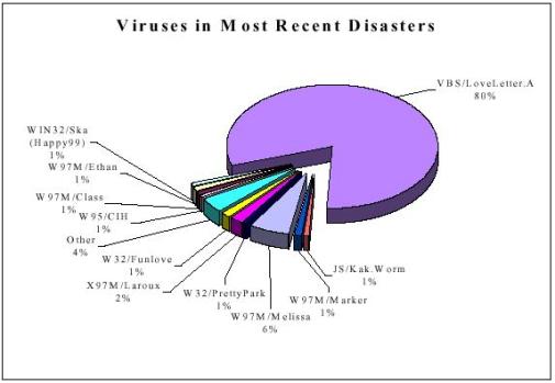 As you can see, JavaScript and VBScript entered the charts, while macro viruses and mass mailers dominated the scene. The chart is somewhat misleading in that it only shows the discrete number of incidents per each type of virus but does not convey the size of the incident. The following chart addresses this question and shows that the LoveLetter virus caused nearly 80% of the incidents in the year 2000, making it the most damaging virus attack of all time.