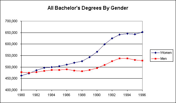 Since the early 1980's, women have earned a larger number of bachelor's degrees than men. By 1996, women earned 55% of all bachelor's degrees in the United States, according to statistics from the National Science Foundation.