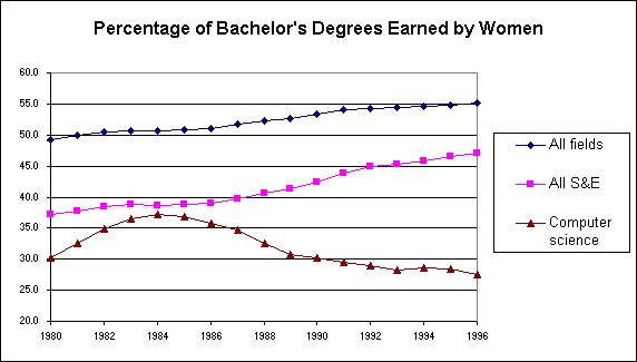 When examined in terms of percentages, the trend differences are clear. Overall, women and men earned about equal numbers of degrees in 1982, and the percentage to women has been steadily rising since then to 55.2% in 1996. In all science and engineering disciplines, the percentage of degrees earned by women has steadily risen to 47.1% in 1996. 1984 had the highest percentage of computer science bachelor's degrees earned by women, 37.2%. That percentage slowly declined to 27.6% in 1996.