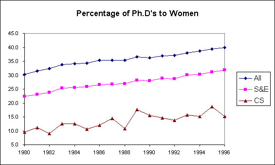 At the PhD level, the gap is even more pronounced, with women earning only 15.1% of Computer Science PhD's in 1996. However, there is a substantial drop in percentages between the master's and doctoral degrees not only in computer science, but in science and engineering disciplines as a whole, as well as for all degrees granted. This may indicate that the academic pipeline shrinkage for women in computer science, while certainly a reality, is not particularly worse than it is in other disciplines.