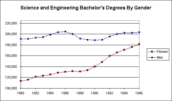 In the science and engineering fields, men earn more degrees than women, but the gap between the number of degrees given to men and women has been decreasing. In 1986, women earned 130,662 bachelor's degrees in science and engineering fields compared to 204,743 to men, a difference of 74,081. Ten years later, men earned slightly fewer degrees, 203,341, while the number of women earning degrees in science and engineering fields rose to 181,333, a difference of 22,008.