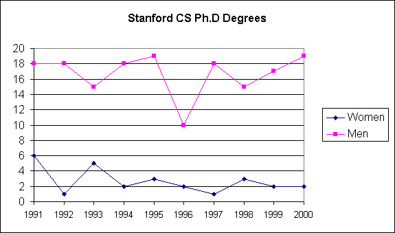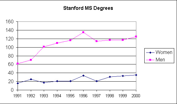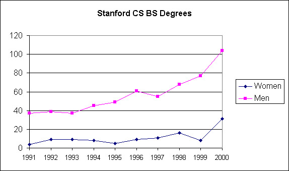 The disparity in the number of degrees earned by men and women in computer science at Stanford is not particularly different from other universities. Compared to the results of the Taulbee survey, the percentages are not markedly different, but they do seem to indicate a positive trend. Whether this trend will continue, or is merely indicative of a short term increase, is not clear.