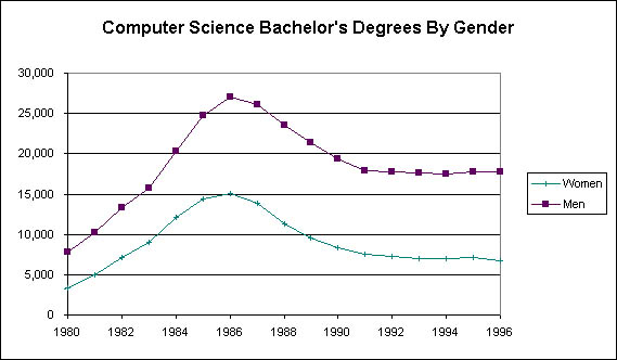 This trend was not uniformly distributed in all science and engineering disciplines. Computer science bachelor's degrees up until 1996, the latest year for which national statistics are currently available, show a gender gap in computer science degree distribution that does not appear to be lessening.