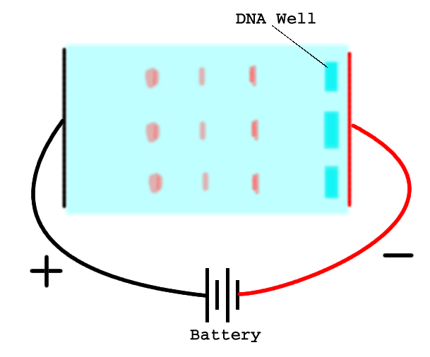 By applying a current to the gel block, the negatively charged DNA molecules are forced through the gel, and smaller ones get out ahead. They form bands that can be detected with ultra-violet light. Fragments of the same length cluster together, and the band corresponding to the proper path-length can simply be cut out. This technique is called "gel electrophoresis."
