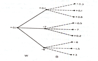 It is assumed that there are three possible moves for the White and if any of these is made there will be three possible moves for Black. The possible positions after both a White and a Black move are the nine points on the right and the numbers are the evaluations of these positions. The White should choose the move that will leave it at the best position possible after Black makes its best move. In the figure the +0.1 is Whiteıs best choice.
