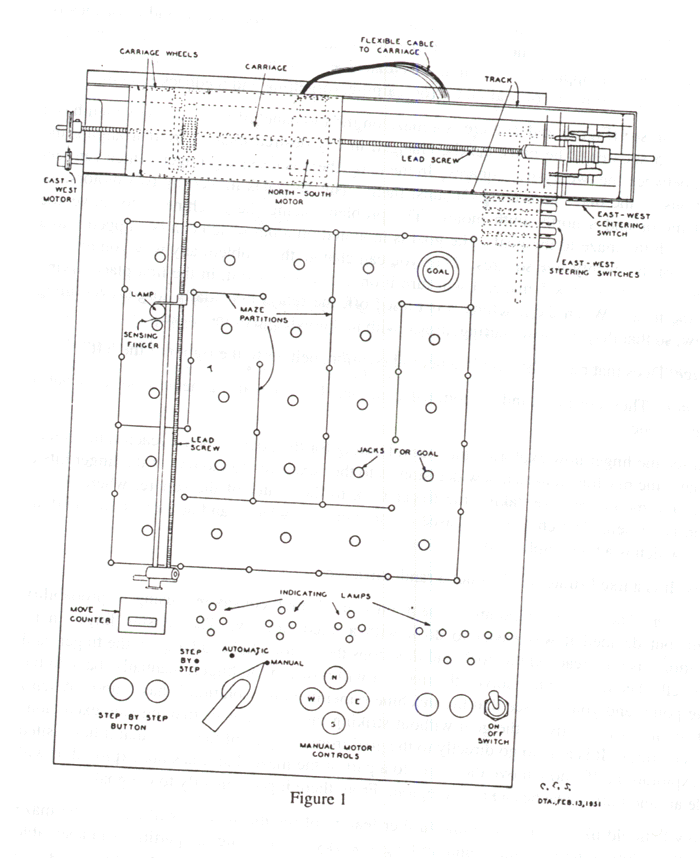 The machine consisted of a maze at its top panel with a range of 5X5 squares. This maze could be changed by rearranging the partitions between the 25 squares. In the maze there was a sensing finger (mouse) that could feel the partitions of the maze as it came against them. This finger was moved by two motors, an east-west motor and a north-south motor (fig. 2).