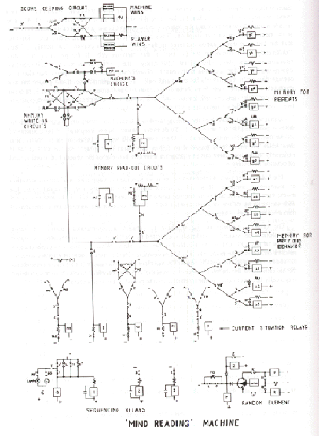 In 1953 Shannon worked on the development of a mind-reading machine. His colleague D. W. Hagelbarger built a machine that played the game of matching pennies. On the front panel of the machine are a start button and two lights marked + and -. To play against the machine the player would have to guess out loud either "right" or "left". The center button of the machine would then be pressed and the machine would light up either the right or left light. If the machine matches the player, the machine wins otherwise the player wins. The player should then move the key switch in the direction corresponding to the choice he made. The machine would register a win for the appropriate party by shooting a ball into the proper glass tube. The overall score is shown on the two counters visible through the front panel.