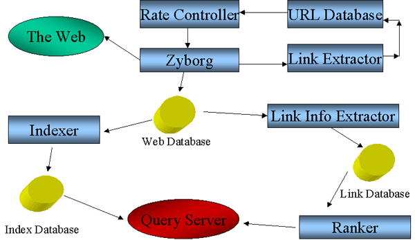 This is an outline of the WiseNut backend structure. It contains both the user query lookup aspect and the web crawling component. The major advances supported by WiseNut take place in Zyborg, their web crawler. It can crawl up to 50 million websites per day, which will allow it to keep up with the rate at which the web is growing. WiseNut also implements the latest prioritizing algorithms. In addition to a modified version of PageRank, as Zyborg scans in a page it reviews the text near a link for keywords. It then uses these to help place the page into a category, creating an automated category directory similar to the manually created one used by Yahoo. This would give WiseNut the benefits of the Yahoo community without needing manual editors that limit the size of the cached database. The problems being encountered by WiseNut have very little to do with their technological savvy. Currently, they are up against the extremely well entrenched household name Google. Only by overcoming their publicity disadvantage can they ever hope to force a showdown between their two technologies. WiseNut is also several years behind in crawling the web - they need to build their database of cached sites up to match that of Google. Once they have done so, then they can begin the battle in earnest for the title of king of the web. |