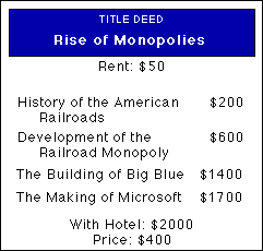The project is divided into four categories. Rise of Monopolies explores the development of monopolies in three industries: railroads, computer hardware, and computer software. Government Regulation of Monopolies delves into the government's past and present role in curbing monopolies and ensuring free and competitive markets. Fears of Monopolistic Power deals with some of the dangers of monopolies with specific historical and current examples. Benefits, Exceptions, and Ethics explores the rationale behind certain monoplies, the potential benefits of a single company's market dominance, and the larger ethical issues involved.