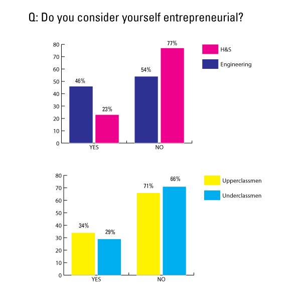 In response to the question, "Do you consider yourself entrepreneurial?" there was a clear divide between engineers and non-engineers. There were more engineers who considered themselves to be entrepreneurial than those who are studying humanities and sciences (46% versus 23%).