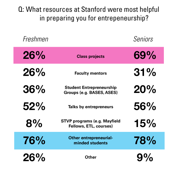 We also asked student entrepreneurs the question, "What resources at Stanford were most helpful in preparing you for entrepreneurship?" in which 77% of respondents cited "other entrepreneurially-minded students." Stanford is an environment where many of its students are open to working with others on ideas that will change the world. Not only that, but the caliber of students at Stanford is one of the highest in the country. It makes sense that entrepreneurs regard their peers as one of the most helpful resources in starting a company. Another interesting data point is the increase in importance of class projects in its role in helping entrepreneurs. There was a huge jump from freshmen to senior respondents, with 26% of freshmen saying the class projects were helpful compared to the 69% of seniors. This can simply be the result of freshmen not having taken many class projects, but even as upperclassmen have taken more project classes, they are finding huge value in them--being able to apply their skills to projects and meet potential collaborators for future endeavors.