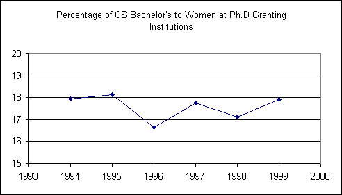 At the PhD level, the gap is even more pronounced, with women earning only 15.1% of Computer Science PhD's in 1996. However, there is a substantial drop in percentages between the master's and doctoral degrees not only in computer science, but in science and engineering disciplines as a whole, as well as for all degrees granted. This may indicate that the academic pipeline shrinkage for women in computer science, while certainly a reality, is not particularly worse than it is in other disciplines.