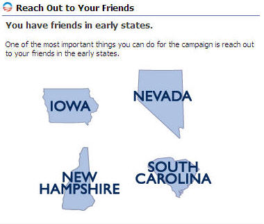 Some applications take advantage of user information to more specifically target their message. Facebook Applications have the ability to view information about users with the application, as well as some information about friends of these users. The Obama Application, which supports Barack Obama's 2008 presidential campaign, took advantage of this feature to target users in states with critical elections. In May 2007, users with the Obama Application were encouraged to "Reach Out to [Their] Friends" in states with early primaries, asking them to support Obama during this critical period. The application even created pre-written pro-Obama messages that could be sent out to all such friends with one click.