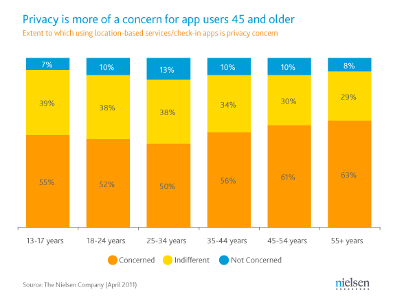 The recent controversy over the logged file of location data found in the iPhone and the Android highlights the significant privacy concerns over LBS apps. Interestingly, according to The Nielsen Company’s latest research (see charts on right), the younger generation is considerably less concerned about such issues. This may be indicative of a trend and the future role of LBS apps, but in the meantime we’ll see where the technology takes us.