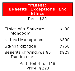 "Get up! It's time for work!" Your Microsoft alarm clock screams at 4 AM. You quickly scramble to get out of bed but not fast enough as your clock screams again: "Don't be late again, or you'll get reported!" You go downstairs to get some breakfast but your old Microsoft Kitchen Cooker just doesn't work anymore. You can't afford a new cooker since the prices are sky-high and you can't go to the store and get food since the Microsoft stores only sell food that works with the later versions of the Kitchen Cooker. Still hungry, you leave your house and hear your house report "Left at 4:27. Six minutes late." Your Microsoft Home is reporting to your boss at work. You get in your old car with the Microsoft Traveler 1.2. It drives you to work, but gets stuck in the traffic jam on the highway since it doesn't have the latest traffic-avoidance feature found in Traveler 2.0, which you don't have because you can't afford the upgrade. You get to work late at the Microsoft CD factory, and find out that your pass key doesn't work. You see a message, "You are late. Your bills for the Microsoft Gas, Microsoft Food, and Microsoft Electricty are past due. You are fired." You turn around and curse the Microsoft monopoly that knows everything about you - you curse the monopoly that you cannot escape.