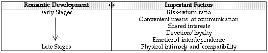 Technology has been shown to have some positive influences for individuals who face barriers to initiating relationships, but it remains to be seen whether it has similar posiive effects in cultivating the development of romantic relationships at all phases. Because success at different stages of romantic development depend on different factors, how technology interacts with these factors will be explored. The following table lists some of the factors relevent to different stages along the spectrum of the development of romantic relationships.