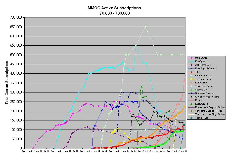 Chart 2: MMOG popularity since 1997, including all games with 70,000-700,000 active subscriptions (Woodcock, 2008). Click to enlarge.