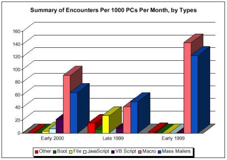Types of Viruses [Top] ![]() Figure 4: Boot viruses have continued to rise in prevalence, while file viruses have declined.[10] Interestingly enough, the White, Kephardt, and Chess paper that noted the overwhelming proportion of boot viruses also attempted to predict the future of viruses. They rightly determined that two major factors would contribute to vast changes in the virus landscape over the following years: 32-bit operating systems such as Windows 95, and the increasing amount of networking around the globe. Up until then, almost all viruses were still transferred through traditional "hard" media such as floppy disks and hard drives, but the authors correctly foresaw that the growing number of people connected to the Internet would cause this medium to become the new battle zone for the present day virus wars.[11] ICSA's 2000 Computer Virus Prevalence Survey details the immense swing from old-era file and boot viruses to the new-age Internet-enabled viruses that began showing up in the mid-90's. In the year 2000, boot viruses and file viruses are practically off the map, supplanted by the more recent mass-mailers and macro viruses. The chart below shows the most prevalent viruses of the last two years: [12]