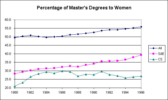 At the graduate level, the gap is even wider, in terms of percentages, with the percentage of master's degrees earned by women in computer science at 26.9% in 1996, about the same as in 1982. This percentage has been nearly constant, at about 27% throughout the 1990's, contrasting the percentage of all science and engineering degrees, which have been steadily increasing from 32.3% in 1986 to almost 40% in 1996. The trend for master's degrees overall is much like bachelor's degrees, with women earning 50% in 1985, and then steadily increasing to 55.9% in 1996.