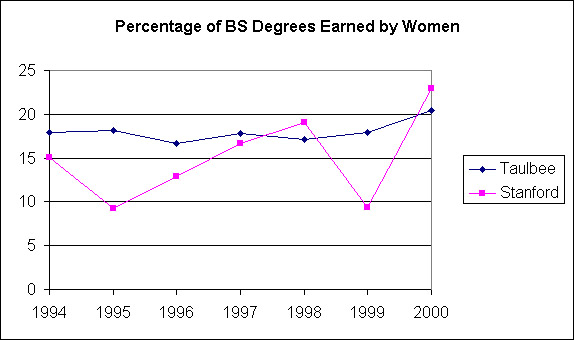 The disparity in the number of degrees earned by men and women in computer science at Stanford is not particularly different from other universities. Compared to the results of the Taulbee survey, the percentages are not markedly different, but they do seem to indicate a positive trend. Whether this trend will continue, or is merely indicative of a short term increase, is not clear.