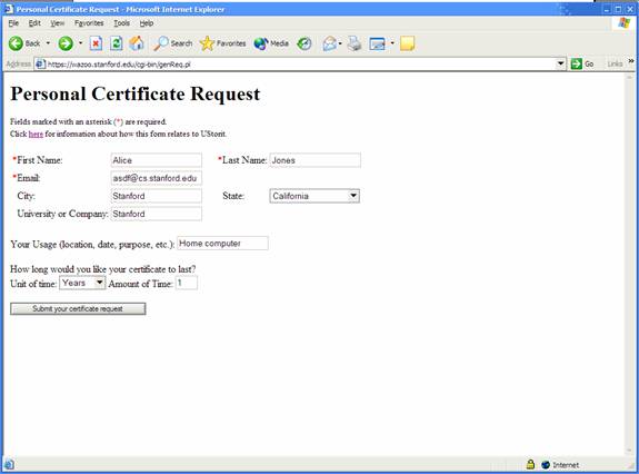 Some notes regarding the various optional fields: if you do not have or do not want a university or company affiliated with this account, use whatever you like, or nothing, for that field. The Usage field is simply a unique identifier for this particular certificate. Some users may find that they need two certificates—for instance, one for a work computer and one for a home computer. That information is intended to go here, because the U-Stor-It CA will refuse to give out two certificates with exactly identical fields for security purposes. The date of expiration of the certificate can be customized if desired: a longer period of validity for convenience, or a shorter one for security. When a certificate is lost or expired, you will need to get another one, but you will still be able to access the same account.