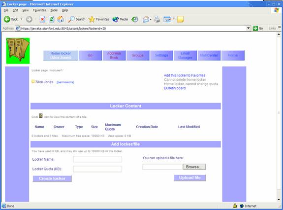 To create your home locker, click the aptly named link “Create home locker”. The resulting webpage will be the central interface to upload and manage your files. To the upper left, you’ll find what will later be a tree diagram of your sub-lockers. To the upper right are locker or file operations based on the currently selected locker or file. A locker’s contents or a file’s information is displayed in the middle, and at the bottom you can create new lockers or upload new files.