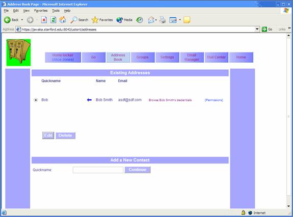 To browse another user’s definitions of quicknames and groups, go to “Address Book” and click “Browse foo’s credentials”. If the user you defined as foo has allowed you to view any of her quicknames or groups, their definitions will appear. If you are not allowed access to any of foo’s definitions, you will not see any definitions.