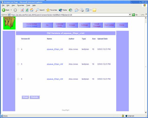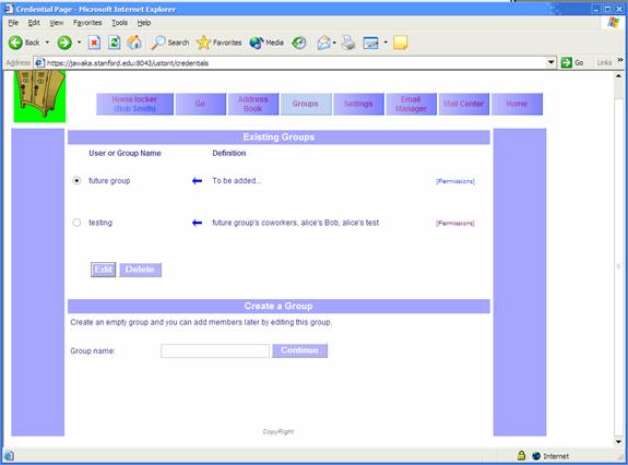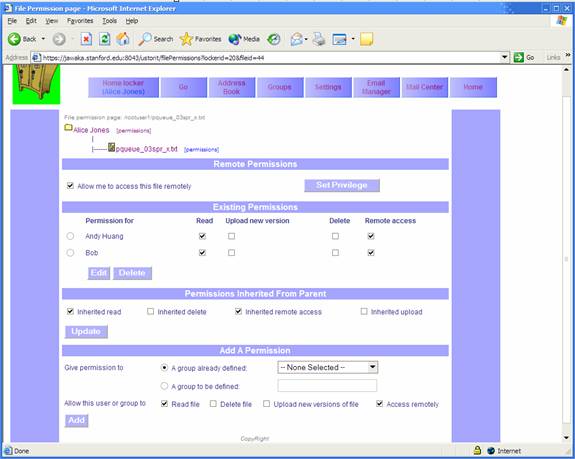 Select a file and click the filename to go to the file settings page. Notice that the tree display at the upper left has a “[permissions]” link for the file you selected. Click that to go to the file permissions page. For now, you can ignore all but the bottom portion, “Add a permission”. If you have already defined some quicknames for people in the address book, you can use those quicknames to refer to those people in the dropdown box for “Give permission to->a group already defined”. For a given quickname, you must specify what rights that user has to this file. “Read file” allows you to view or download the file, “delete file” allows deletion (!), and “upload new version” and “access remotely” permissions are discussed in Sections 3.3 and 3.6, respectively.