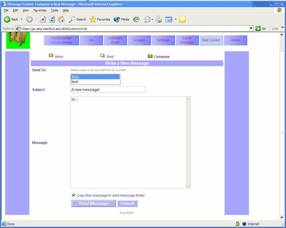To compose a new message, you must have already defined a destination user or group with the “Address Book” (See 2.3) or “Groups” (See 3.1). In the “Send To” field of the “Compose” page, select the user(s) and/or group(s) you’d like to send the message to.