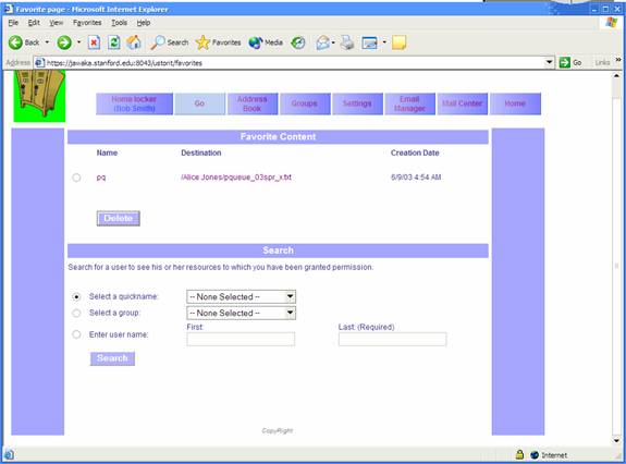 If you find that there is a resource in another user’s locker that you would like easier access to, simply “Add this file to Favorites” with the link at the upper right for each file or locker. After choosing a name for the favorite, you will now be able to access that resource by going to the “Favorite Content” section of the “Go” page and clicking on the desired “Destination”. To change the name of a favorite, click on the name you assigned. To delete a favorite, select a radio button next to the desired favorite, and click “Delete”.