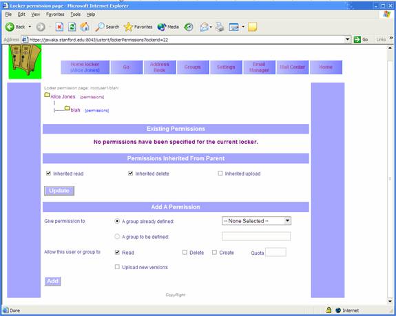 To mark a locker with Read/Delete/Create/Upload Version privilege, click “[permissions]” next to the locker name in the tree display and add permissions just as you would to files (See 2.4). Now, all files within will have, by default, those same permissions for those users. When delegating “Create” privileges, you must also specify a quota representing the maximum amount of disk space that the user can consume.
