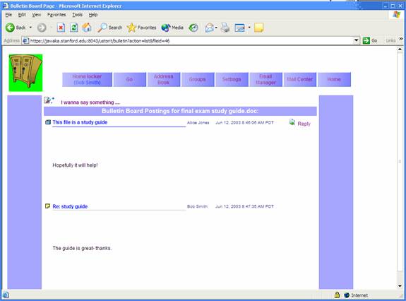 Bulletin boards in U-Stor-It serve the purpose of a discussion forum for particular files or lockers. Each file and locker gets its own bulletin board, which begins empty. To access a file or locker’s bulletin board, click “Bulletin board” in the upper right on a file settings or locker contents page. Messages previously posted by users will appear in chronological order. To post a message as a new topic, click “I wanna say something…” and fill out the subject and message fields. To reply to an already existing topic, click “Reply” next to the desired topic.
