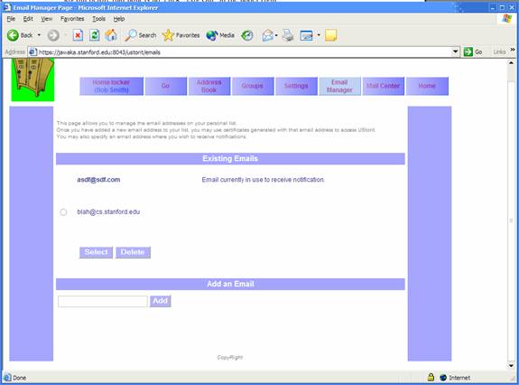 To affiliate additional email addresses with your account, go to the “Email Manager” tab and add a new email at the bottom. A list of email addresses appears in the middle, where you can select one as the primary email address where message notifications will be sent. You can also delete affiliated email addresses by selecting one and clicking “Delete”.